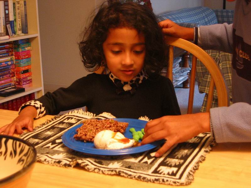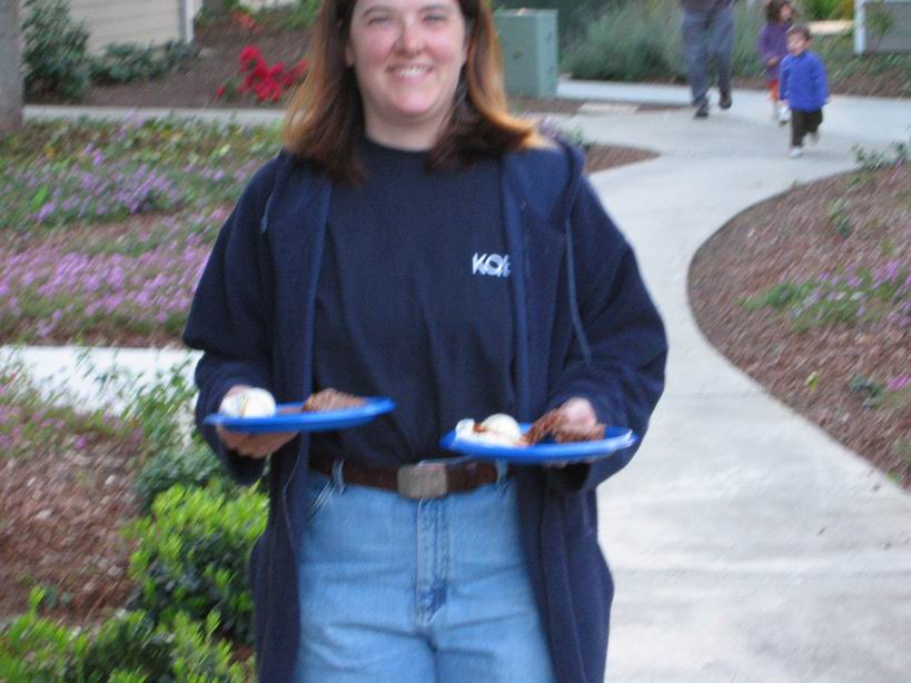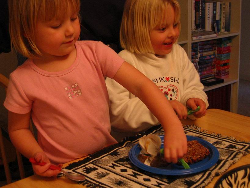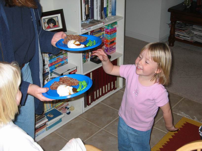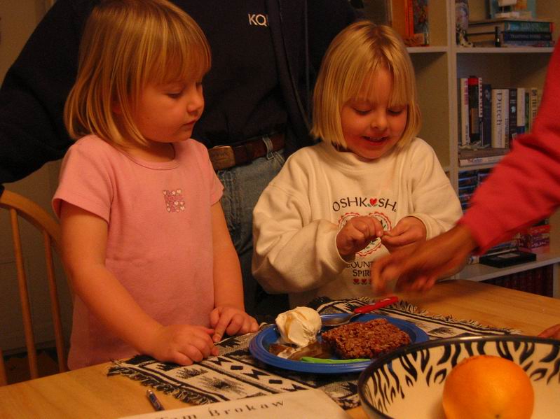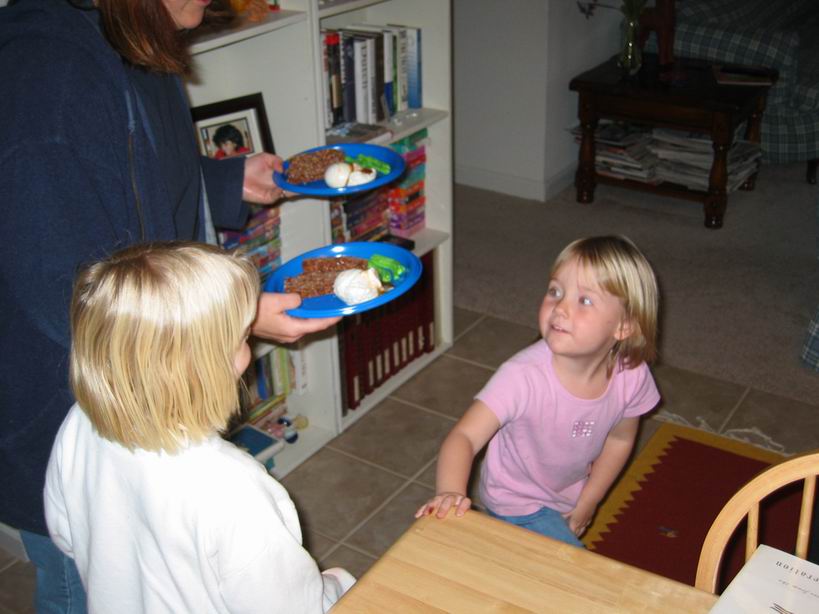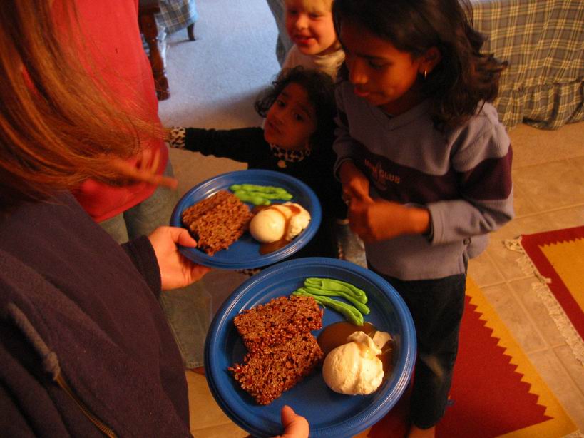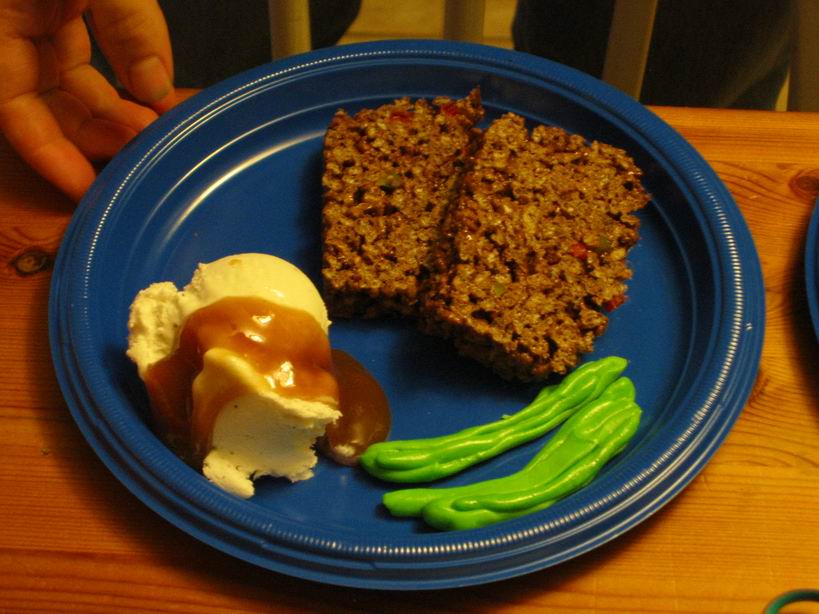 dinner consisting of meat loaf, green beans and mashed poatoes with gravy. It was reallty made with Cocoa Krispie Treats, Jolly Rancher chewys and ice cream with caramel sauce. The girls had a great time with all the candy, anyway. |