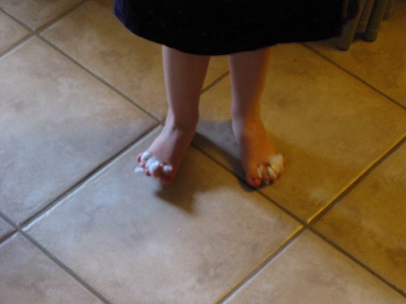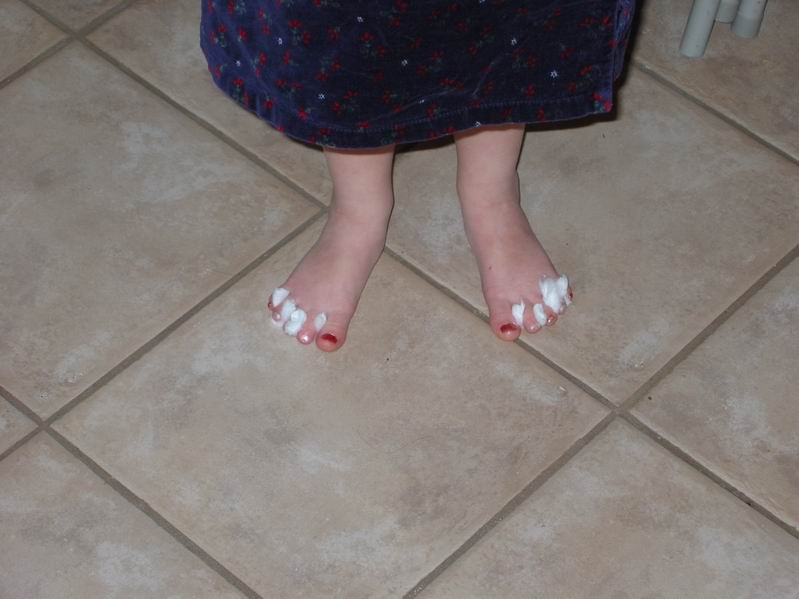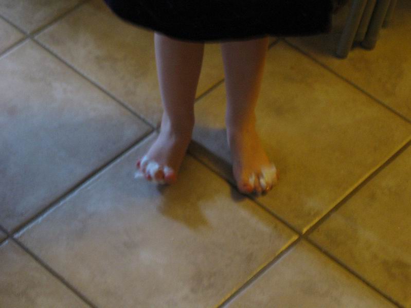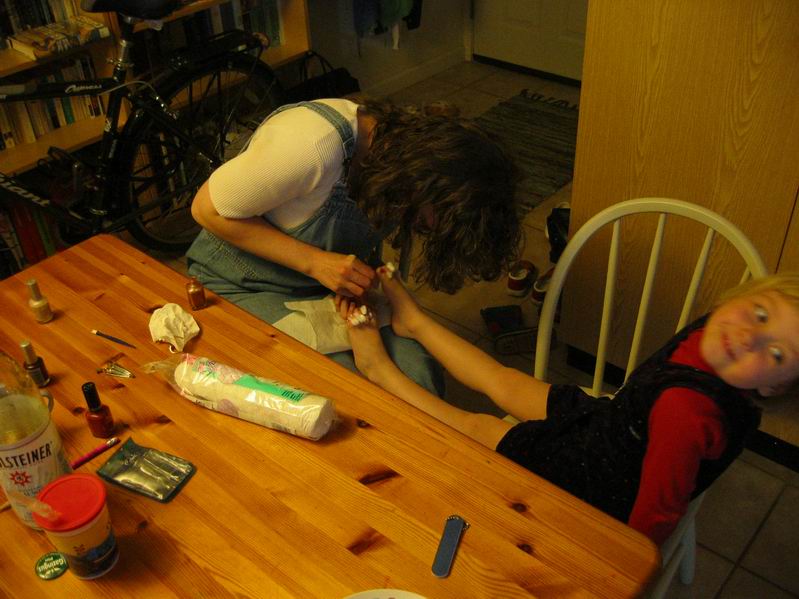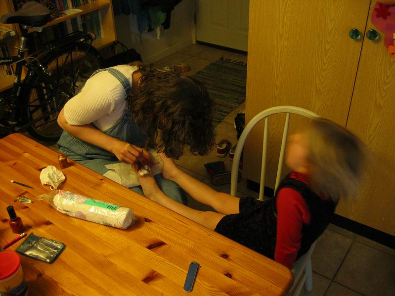 | Pigerne fik malet tånegle en aften da Kaj og Cyndi var på besøg. De er ret vilde med at få neglelak på. | ||||||||||