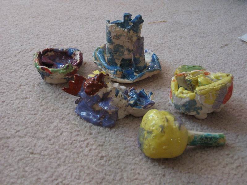 Rebecca has been going to clay classes. Here are her results (Monica also made one sculpture).